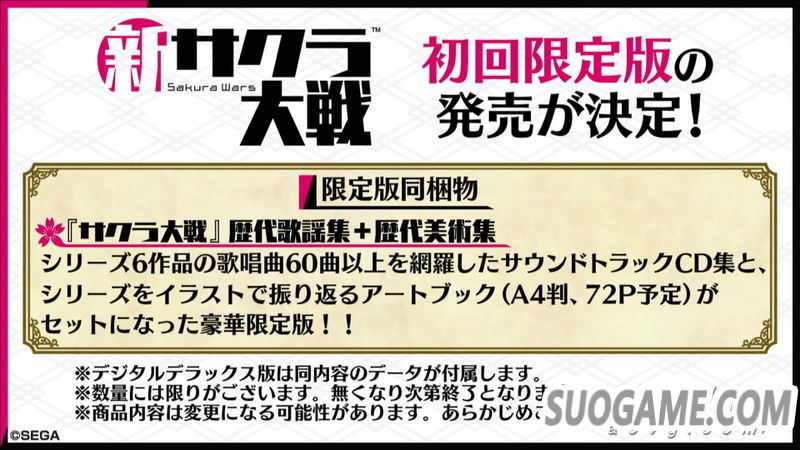 最后本作公开了初回限定版情报,限定版包含《樱花大战》系列历代音乐集及美术集,其中音乐集收录系列6部的歌曲60首以上。