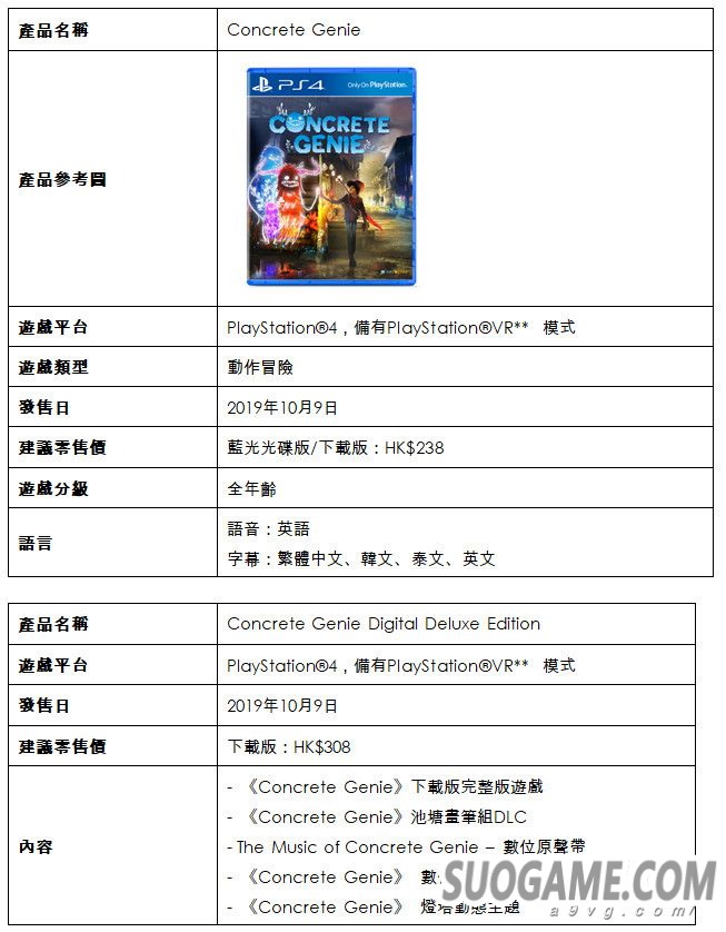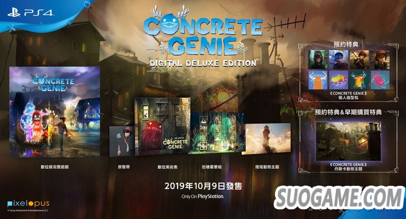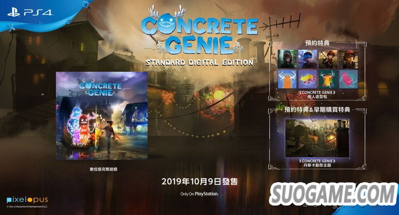 Sony Interactive Entertainment Hong Kong Limited(SIEH)是日宣布,PlayStation?4游戏软件《Concrete Genie》将于北京时间2019年10月9日推出,标准版(蓝光光碟版/下载版)的建议零售价为港币238元,Digital Deluxe Edition的建议零售价为港币308元。