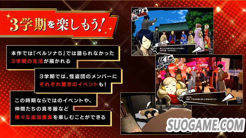 之后则回顾了一下目前已经公开的一些新要素,包含两名新角色、第3学期剧情、新的场景“吉祥寺”、迷宫探索以及战斗中的新功能、新人格面具等,这里便不再详述。制作人表示还有数名角色未公开新的人格面具,将于下周的Fami通杂志中揭晓。