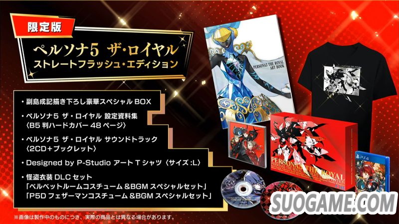 最后则是商品介绍以及限定版的展示。本作的限定版包含豪华包装盒、设定资料集(B5开、48页)、原声CD(1张盘+小册子)、P-Studio设计的艺术T恤(尺码L)、怪盗服装DLC套装(天鹅绒房间服装与BGM、P5D舞者服装与BGM),价格13800日元+税。