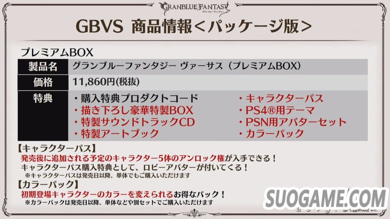 豪华版:11860日元。包含实体普通版内容+豪华包装盒、特制原声CD、特制画集、角色DLC季票、PS4主题、PSN头像、角色换色包。