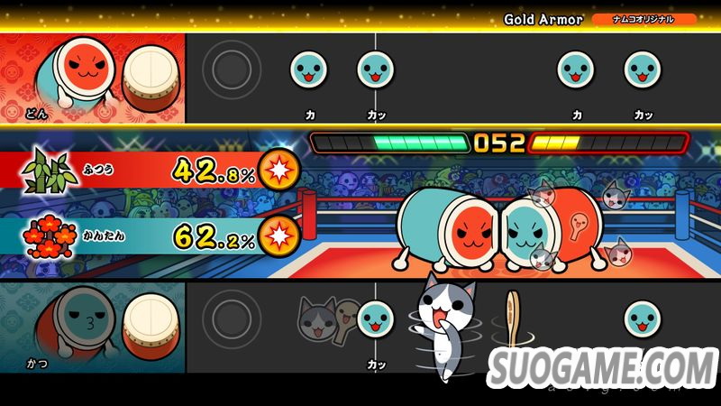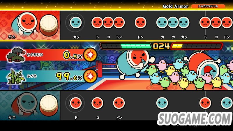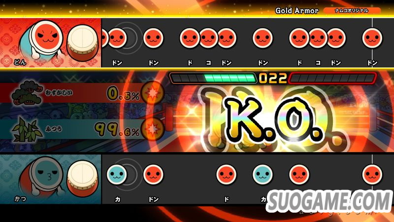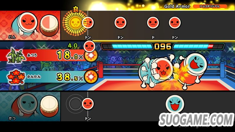 顺利演奏的情形下可以累积太鼓POWER,累积到100%时即可攻击对手,疯狂攻击K.O.对手、让对手的体力量表归零吧!演奏结束后,剩余体力较多的一方将获胜。此外,除了游戏本篇收录乐曲以外,追加下载DLC乐曲也能对应此模式,玩家们可用喜欢的乐曲尽情对战!