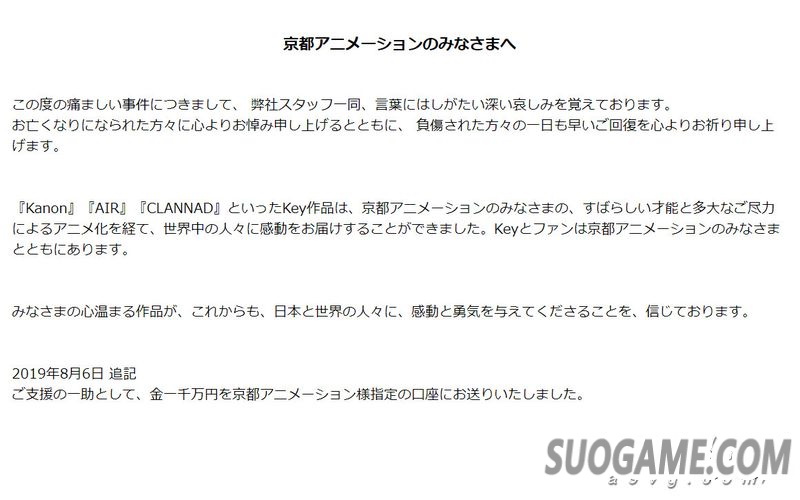 知名美少女游戏公司Key社日前宣布为京都动画捐款1000万日元,此前京都动画曾负责过《Kanon》《AIR》《CLANNAD》等多款Key社作品的动画化。