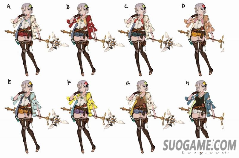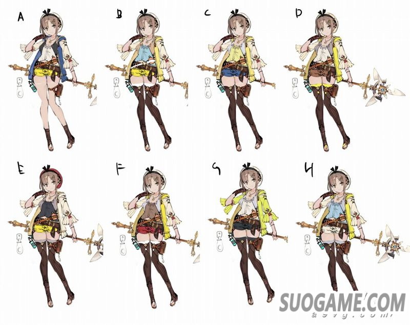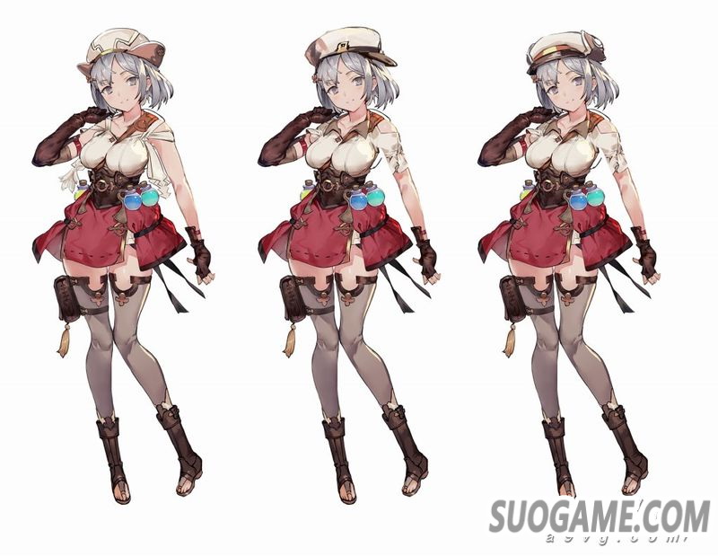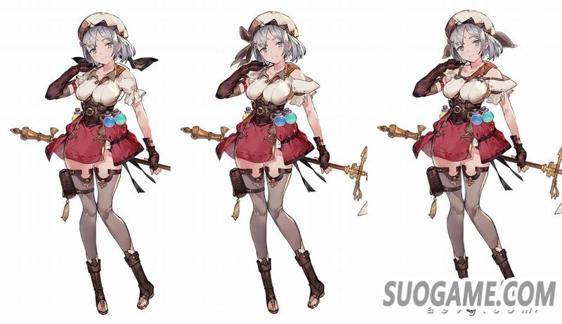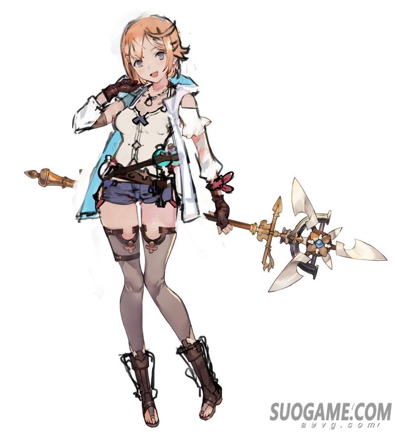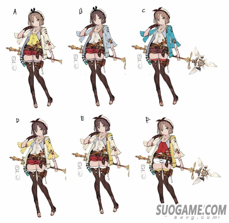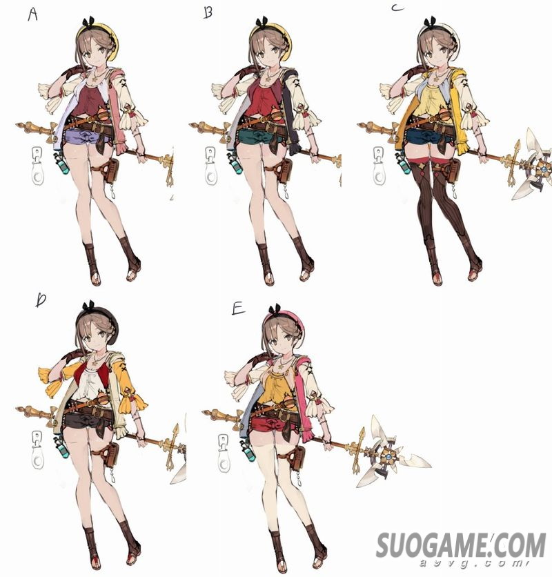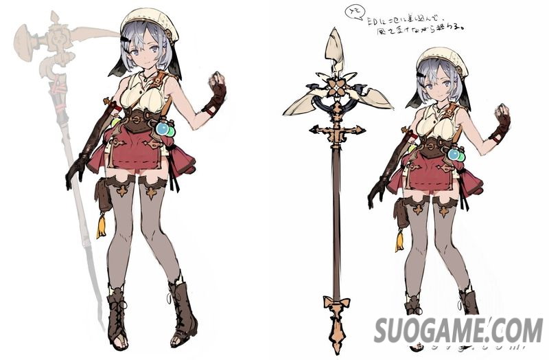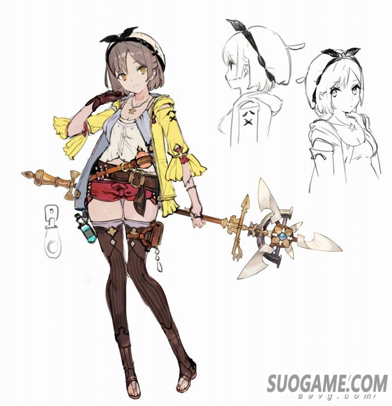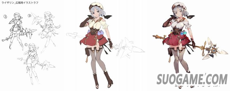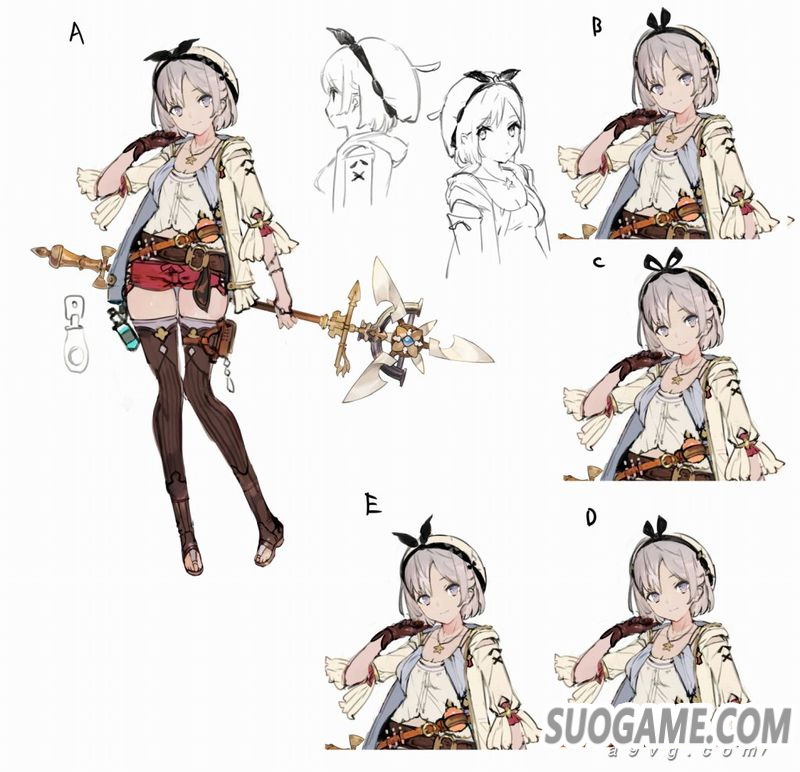 于是随后就加上了帽子、裙子以及一些炼金术相关的东西,《工作室》主角的感觉就逐渐出来了。武器也是在这个时期定下了设计。经过一些细节修改后初版的莱莎就已经暂定了,甚至还画了宣传用的图。