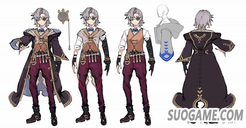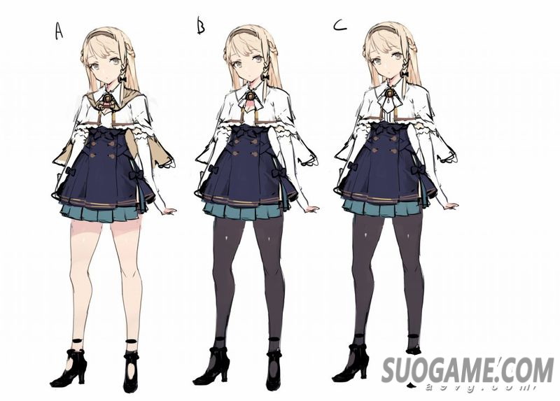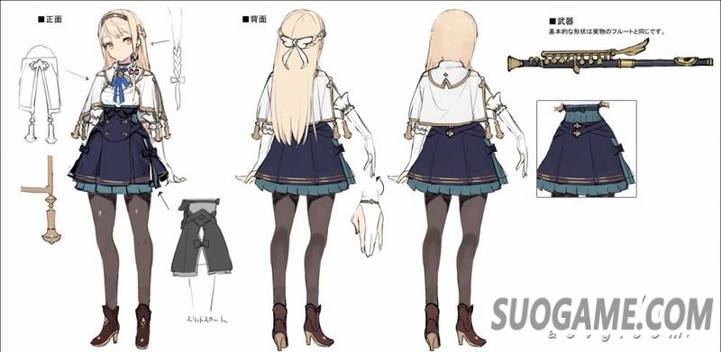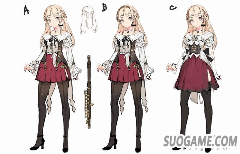 科洛蒂娅这种大小姐系的角色其实并不是トリダモノ擅长的类型,初期设计是切口的裙子。后来考虑到其武器是长笛,所以服装参考了指挥者常穿的燕尾服设计,另外还考虑到大小姐必不可少的是黑丝。