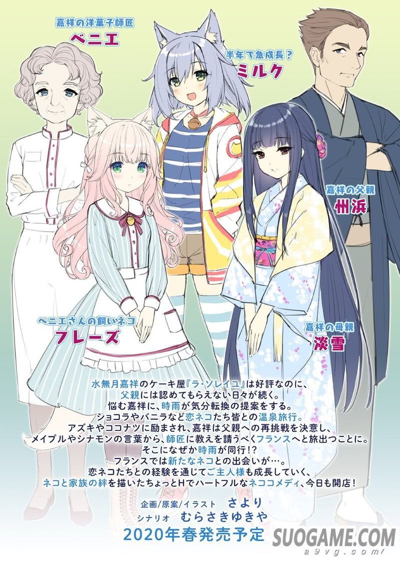 正在制作中的《猫娘乐园4》(又译:巧克力与香子兰4)公开了一张新的宣传图以及部分角色设定图。目前这款游戏预定于2020年春推出,负责原案·原画的为さより,剧本由むらさきゆきや担当。