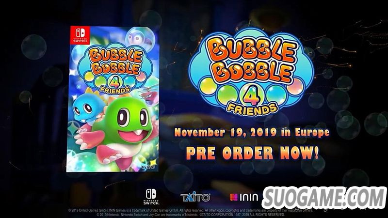 今日ININ Games与开发商Taito宣布《泡泡龙 四个朋友》登陆Switch平台,支持4人联机游玩。本作将于北京时间2019年11月19日率先在欧洲地区推出,之后于2020年第一季度登陆北美地区。