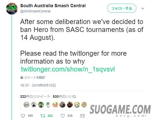 在澳大利亚南部,一个在当地举办《任天堂明星大乱斗》系列作品非官方比赛的主办组织South Australia Smash Central在最近通过官方推特宣布禁止在该组织主办的活动与比赛中使用最近推出的DLC角色「勇者」进行比赛。