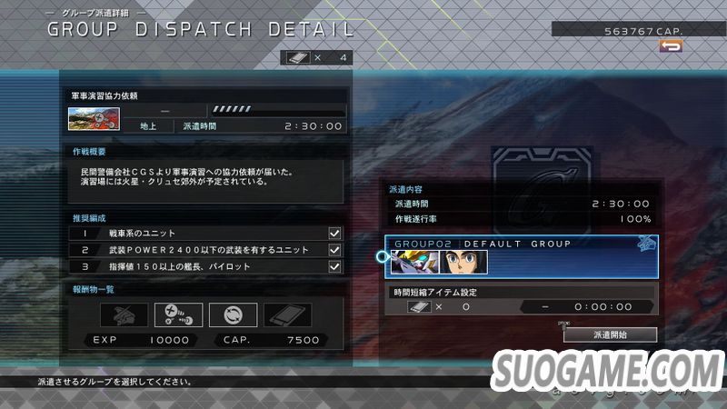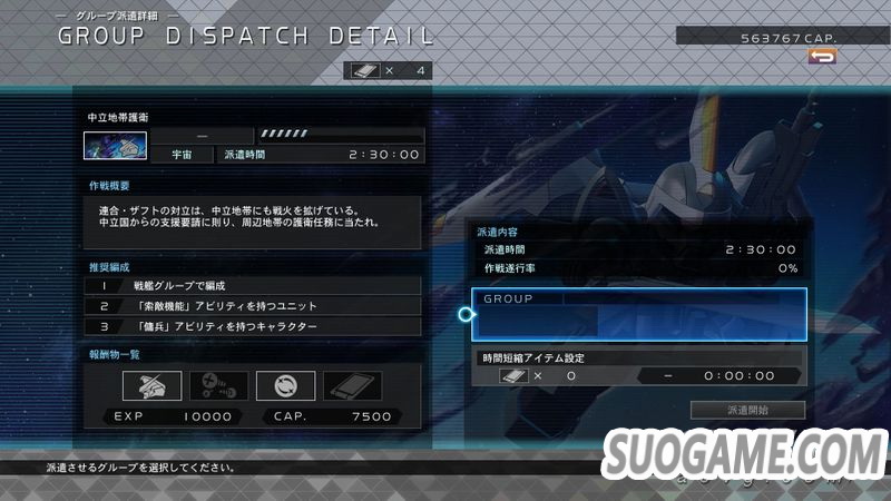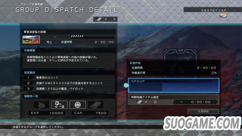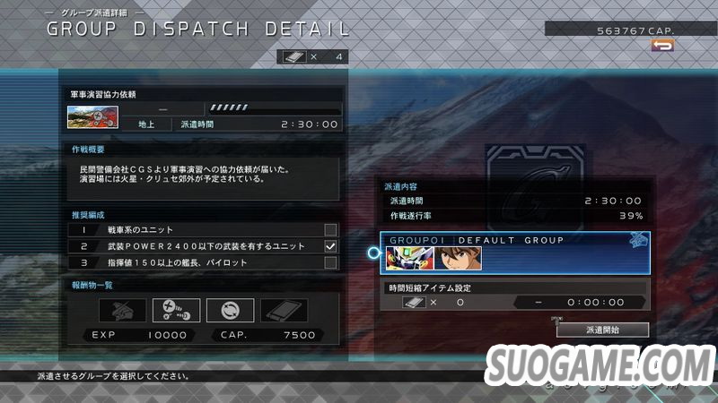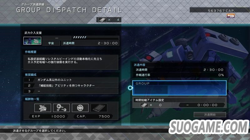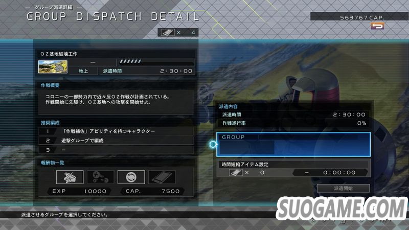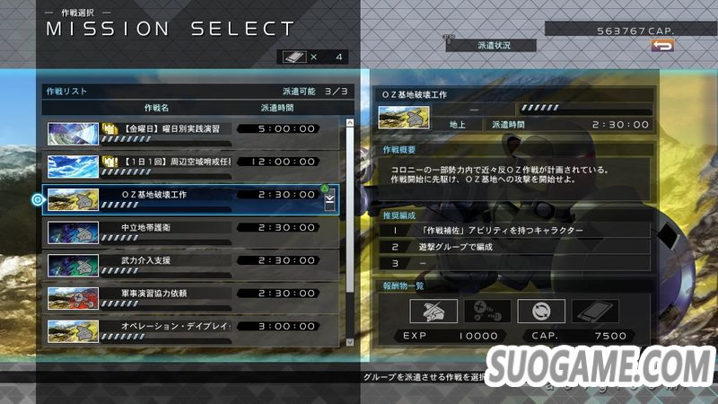 本作新要素,可以派遣不进行推图的小队去执行任务,每个任务有不一样的派遣时间,时间完成后小队归还,并可获得GP(钱)、机体或是部件。如果派遣的小队符合当前任务的推荐配置,则提高作战执行率,如果手游玩的多的话这个功能特别好理解,没有的话可简单理解为执行率越高报酬越丰厚。