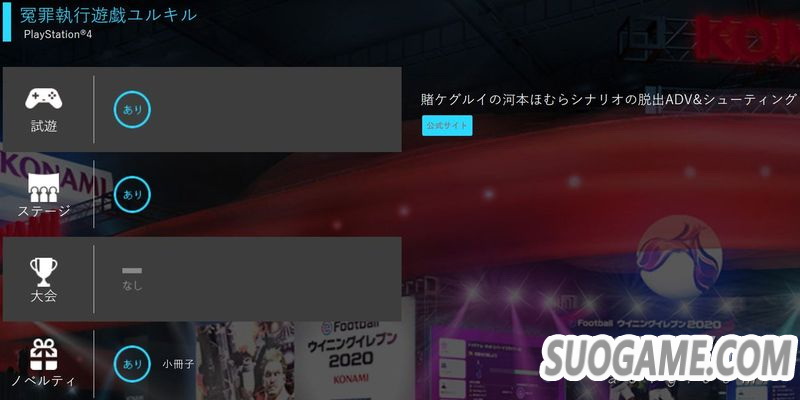 KONAMI公开的TGS2019出展阵容中有一款未发表过的PS4新作《冤罪执行游戏》,根据描述这是一款由《狂赌之渊》作者河本焰负责剧本的脱出ADV+射击类游戏,在9月13日的舞台活动中预计将公开详情。而从出展信息看这款游戏还会直接在TGS现场提供试玩。