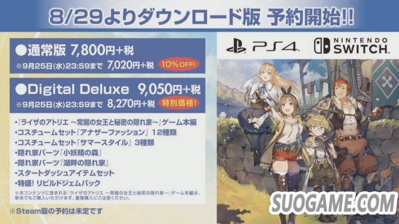 《莱莎的工作室》将于北京时间9月26日登陆PS4/Switch平台,10月29日登陆PC平台,中文版同步。游戏的下载版会在8月29日开始接受预约,截至9月25日9折优惠。另外本次在会推出附带各种特典的数字豪华版,包含各种服装DLC和家具部件等内容。