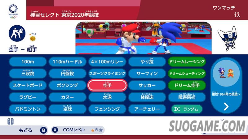 2020年东京竞技项目·21种竞技项目、梦幻竞技·3种竞技项目、1964年东京竞技项目·10种竞技项目都可以1个人练习。按键操作对应所有的项目,根据竞技项目不同会有对应使用Joy-Con?的体感操作。
