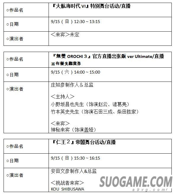 此外,本日公开情报的『无双OROCHI 蛇魔3 Ultimate』也预定会展出影片和实施舞台活动。