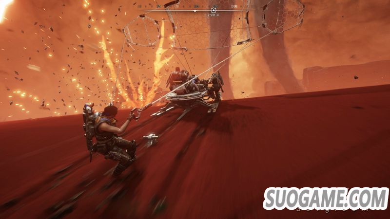 战争机器这个系列始终在其所处的世代中走在画质水准的前列,只不过它在最新一代中表现得更好。你可以把游戏进程调到第三幕,开着帆船去沙漠中央测试一下。这是一个天气效果极为复杂的区域,火焰、雷击、飞石、沙尘暴、龙卷风,这些元素都混合在一起,你甚至会觉得有点华丽过头了。可当它们叠加起来,游戏依然可以保持稳定的帧数。同样级别的场景还出现在这一幕的火箭基地、第四幕的巷战、第二幕的冰山等区域。所有这些场景都给我留下深刻的印象。
