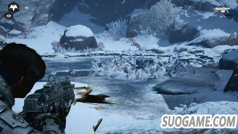 这两张地图呈现出完全不同的视觉效果,在特征上各有千秋。我觉得你可以在这些地方体验到一种细腻的感觉,是环境和游戏性之间的联系。战争机器系列中始终保持着环境破坏的传统,不过这回算是更贴切了。比如在冰原的关卡中,敌人要是躲在冰柱后面,你可以把冰柱打碎让它无处藏身;而当敌人站在薄冰面上时,你甚至可以打碎冰面让他们掉进水里。沙漠中也有这些与环境结合的特征,有一个关卡是在大风中据守要塞,你可以看到敌人捱过飓风向你冲锋,而你可以趁机在大风中搞定他们,让他们被风吹走;在沙漠中游荡时,我还在路过一个废弃营地时被沙堆里冲出来的残骸突袭,这种桥段也确实适合出现在沙漠里。