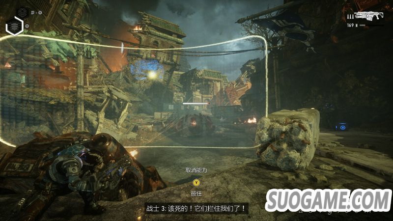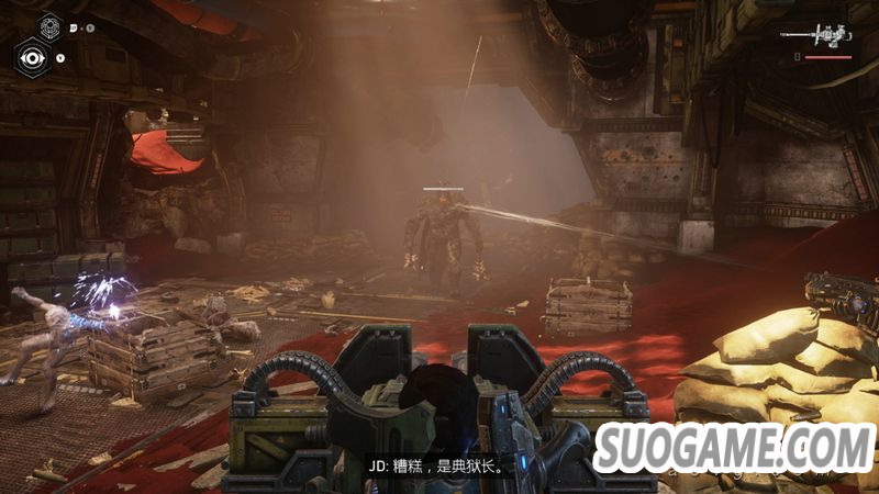 杰克的全能性强大也在彰显战斗选择的多样性。似乎在我们的印象中战争机器永远是刚正面的游戏,双方照个面就拉架势开干,拳头对拳头或者藏到掩体里对射。但现在战斗有了更多选择,这种选择的主动权一部分来自于杰克的赋能。比如在一些场景中,你可以先扫描出敌人的位置,然后隐身或者悄悄走过去从背后干掉他们。第一幕末尾有一个这样的关卡,你可以利用偷袭的方法干掉整个区域的敌人。