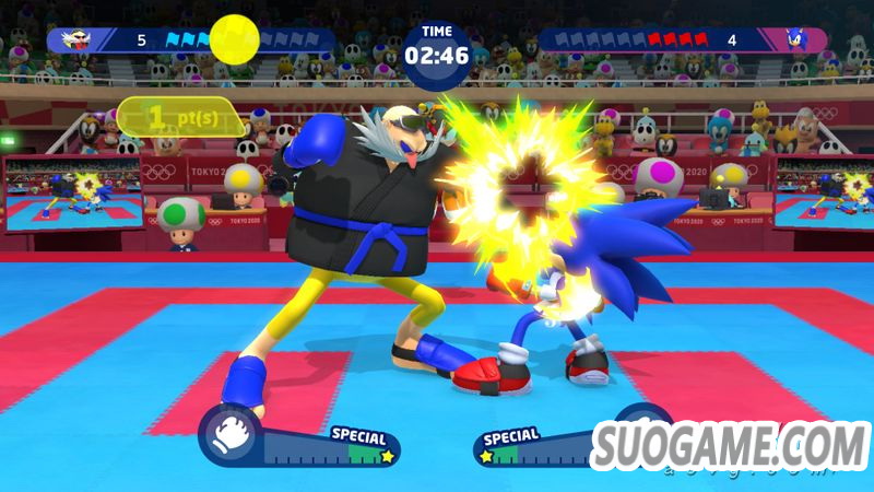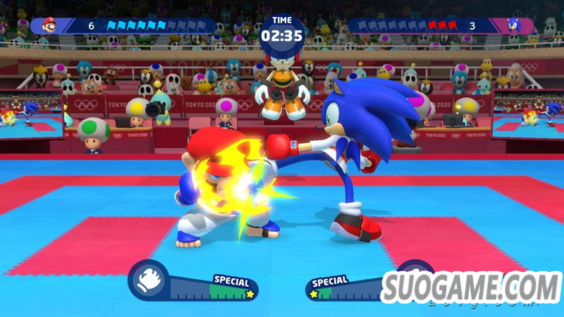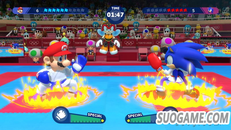 在本作中,马力欧和索尼克他们会进行对打比赛。在规定时间内比拼谁先获得10分。除了直拳,踢腿等基本动作外,还有能够破坏对手平衡的攻击,有动作充满动感的攻击,有能够获得更多分数的「一击必杀」等等,在使用丰富的攻击动作的同时,也能体验需要相互预判对手距离的这种具有空手道风格的攻防对决。
