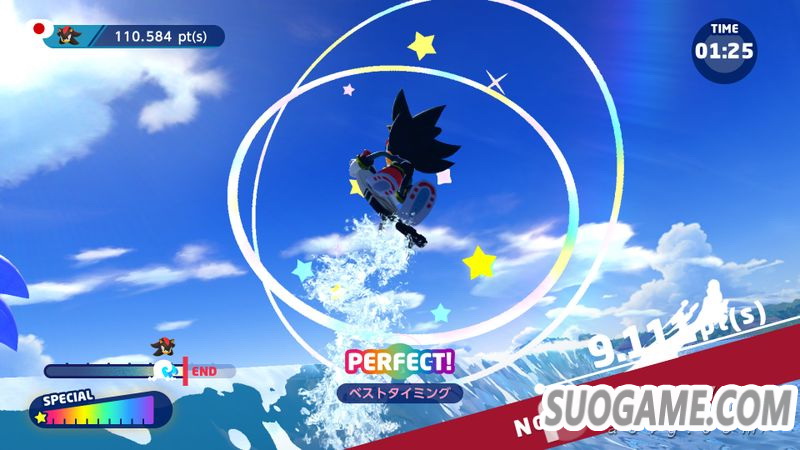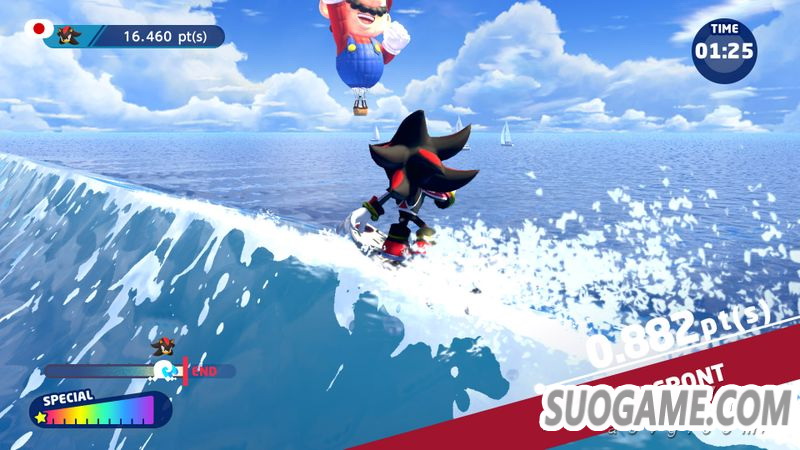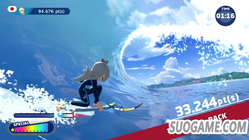 在规定时间内乘上海浪,通过完成花式获取分数。通过总分比拼排名。通过跳跃或漂流来积攒特殊槽,攒满后可以发动高分值的特殊花式。通过特殊花式进入加速状态,可以获得更多的分数。
