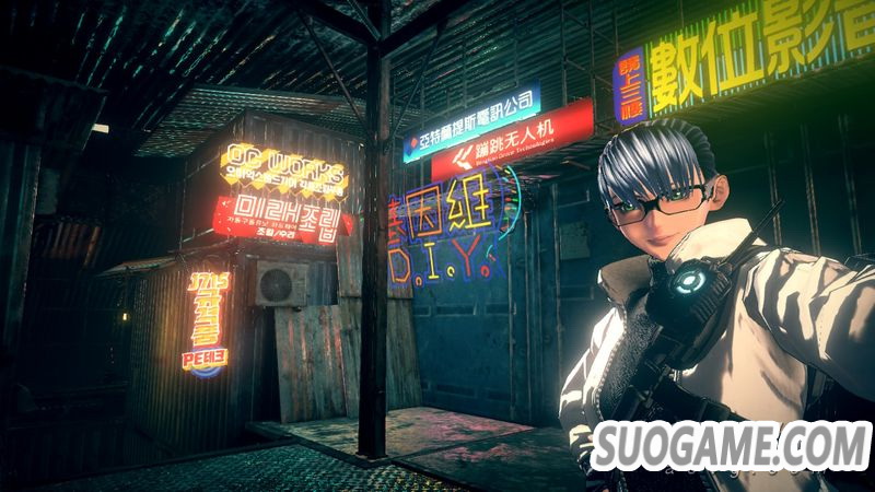 从游戏的画面表现来说,本作特别好的宣传了白金游戏的开发实力。光影和贴图材质看着非常舒服,也看不到多边形锯齿。可能是因为掌机模式下屏幕的尺寸问题,看着感觉甚至比TV模式还舒服一点。虽然游戏只有30帧,但大部分时候运行的帧率都特别稳定。尽管也有一些敌人比较多的场景下会出现掉帧的问题,比如在FILE08的时候就比较明显。除了帧数与分辨率等数值之外,本作的画面风格也让我非常喜欢。尤其是在管制区域外的场景,破破烂烂的设置配上五彩斑斓的霓虹招牌,非常具有未来时代贫民窟的感觉。