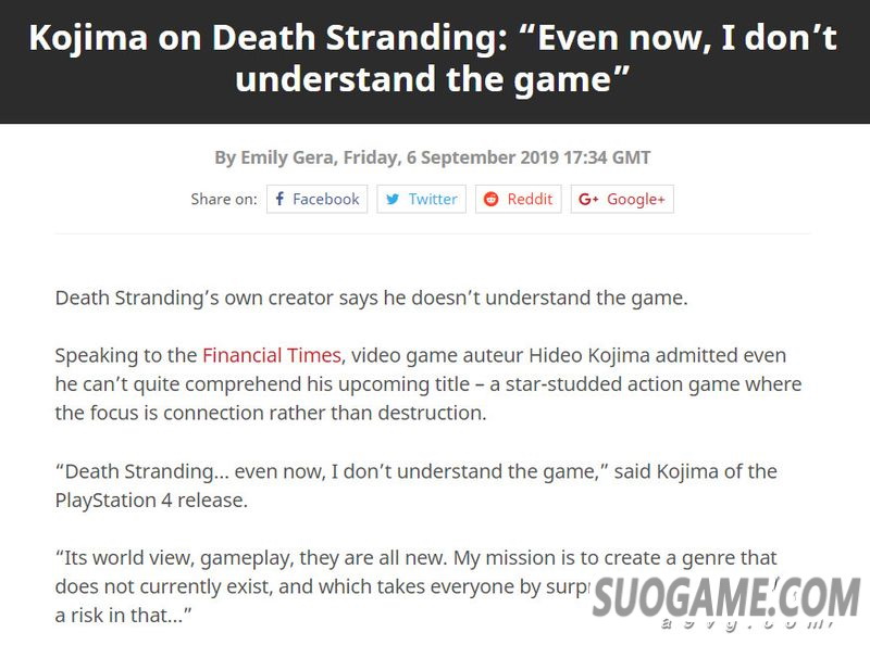 据外媒报道,小岛秀夫在接受Financial Times采访时表示“其实现在我也不太懂《死亡搁浅》,这个游戏的世界观和玩法都是全新的,我的任务就是做一个前所未有的东西,当然这当中伴随着一些风险。”