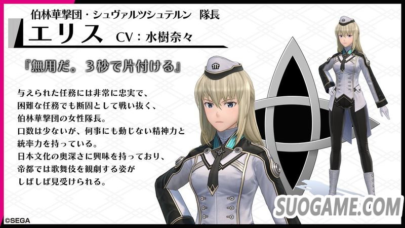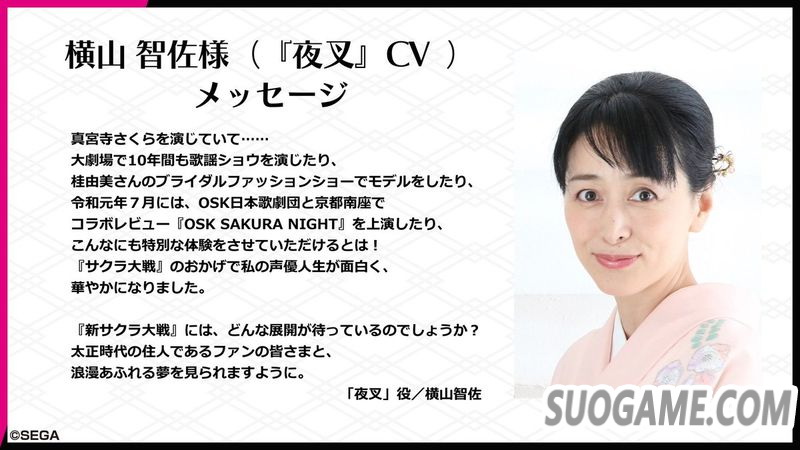 在今日的TGS上,《新樱花大战》公开了新华击团“柏林华击团”,以及一名神秘新角色夜叉,声优为横山智佐。