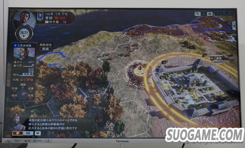 另外值得一提的就是这次电脑的AI十分聪明,你这边稍有空袭他立刻就出兵打。这次的试玩版中玩家扮演的是曹操,北有吕布南有袁术。虽说任务是让你打吕布,但你少出兵难以获胜,多出兵则袁术趁虚而入。据笔者观察了几个现场试玩的人结果都被两家搞死了……