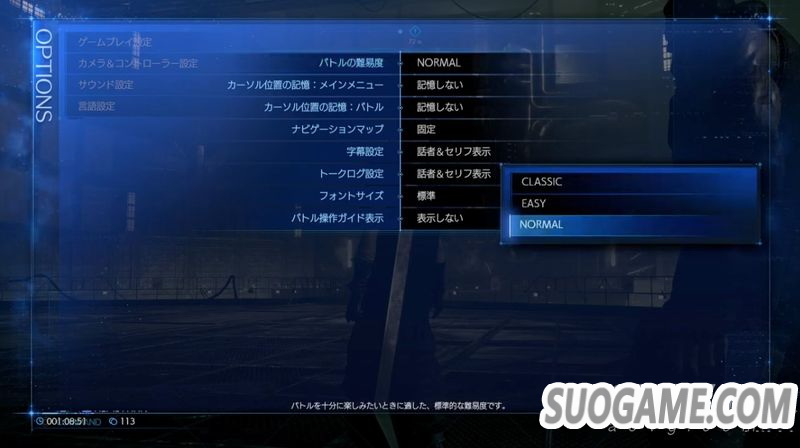 本次试玩开始的位置稍早于E3和CJ的DEMO,后半部分相同。我们还能看到游戏菜单选项,其中提供了三种难度——经典、简单、普通。战斗难易度设置为「经典」后,操作角色会自动进行一定程度的攻击和回避,玩家在战斗中只需要专注于积累ATB槽和使用技能就可以了。