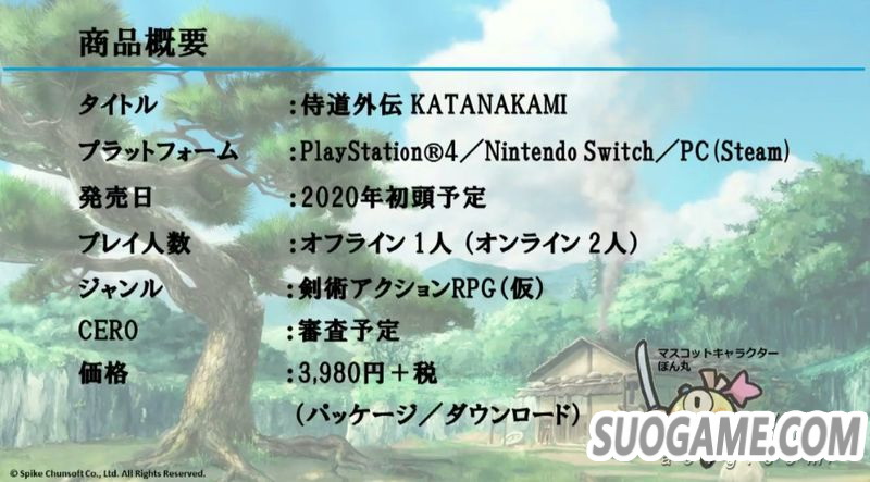 Spike Chunsoft在TGS2019舞台活动上公布侍道系列新作《侍道外传 刀神 》,类型为ARPG,预定将于北京时间2020年初登陆PS4/Switch/PC(Steam)平台。