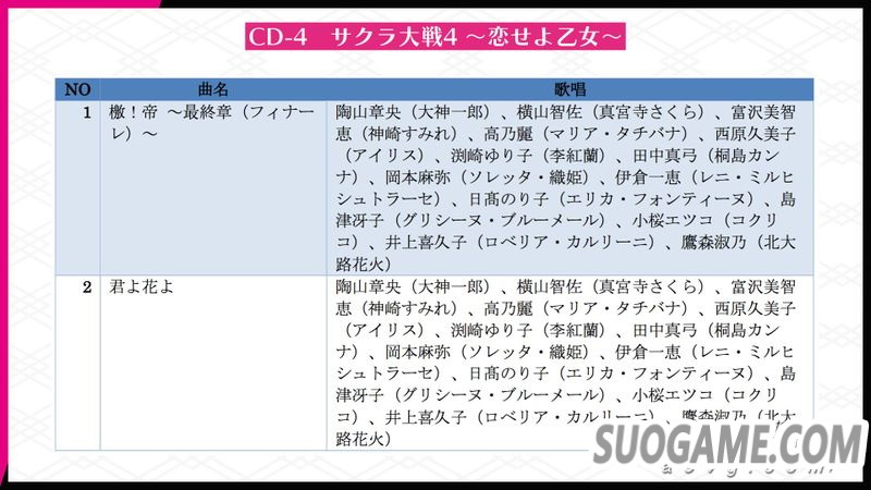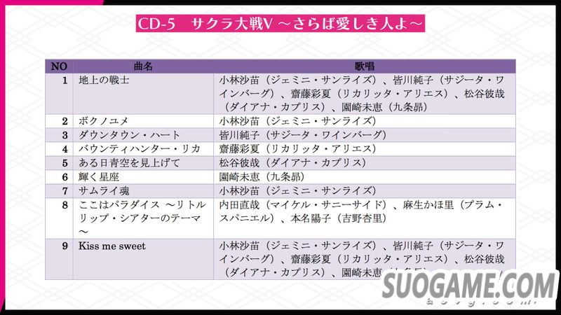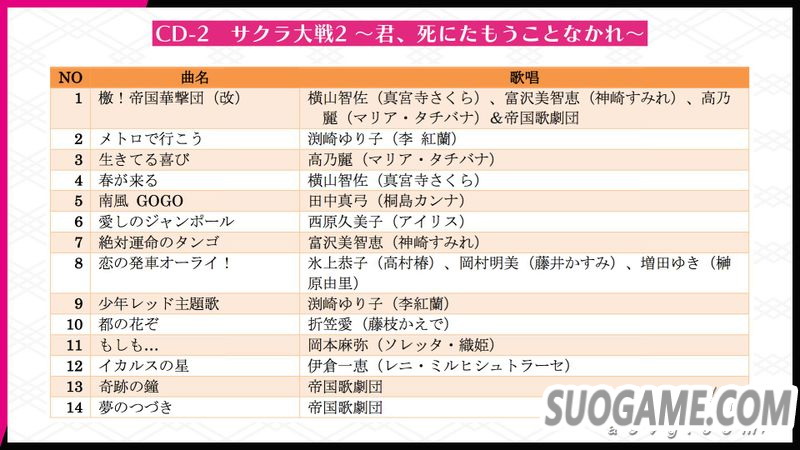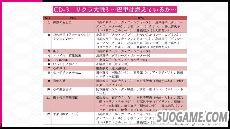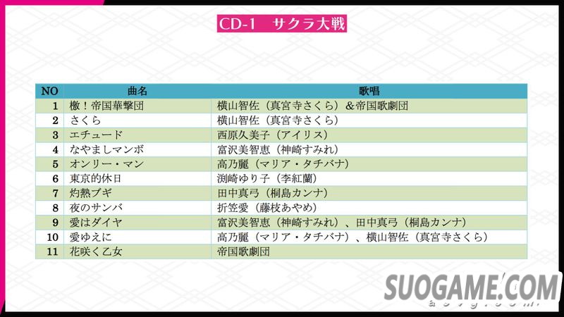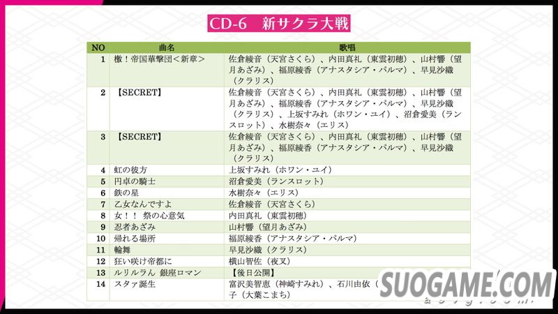 随后,官方公开了《新樱花大战》初回限定版中附带“历代歌谣集”的详细信息,共有6张CD、总计62首乐曲,下图为收录的曲目列表,其中本作有几首曲目暂时保密中。