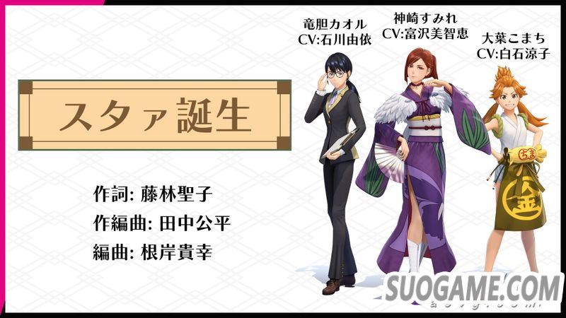 游戏新曲试听「スタァ誕生」。演唱:神崎堇(富沢美智恵)、龙胆薰(石川由依)、大叶小町(白石涼子),作词:藤林聖子,作编曲:田中公平,编曲:根岸貴幸。
