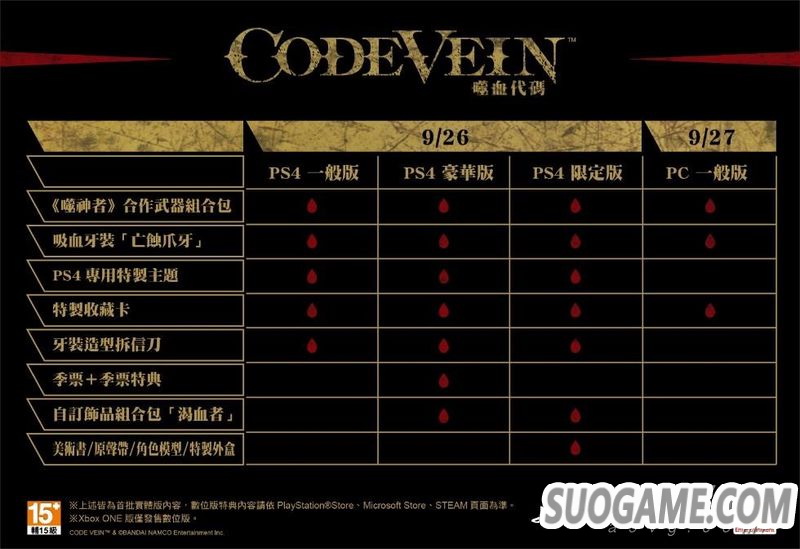 PS4繁体中文版独家送!购入首批PS4《CODE VEIN 噬血代码》繁体中文版可获得: