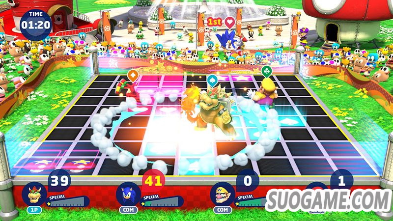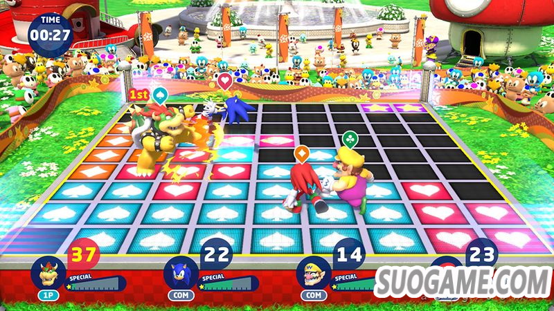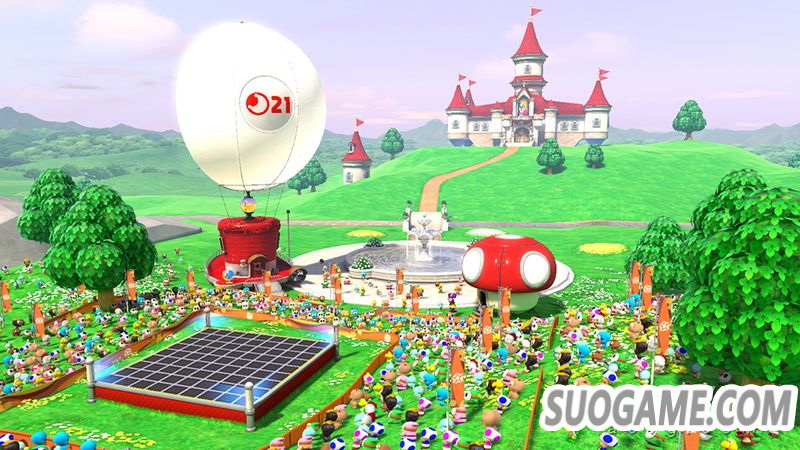 场景是以蘑菇王国为主题,桃花公主城堡自不必说,还可以在奥德赛号和疯帽商店的背景下体验对战的乐趣。