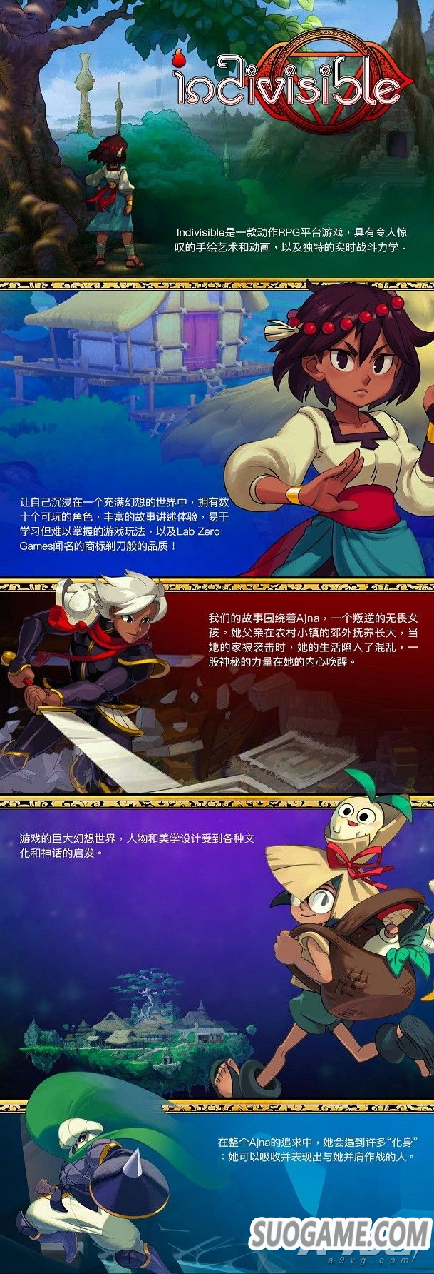 《Indivisible》巨大的幻想世界、人物与美学设计受到各种文化和神话的启发。在Ajna的冒险旅程中,她会遇到许多“化身”,她可以吸收这些角色并召唤他们来并肩作战。游戏中有大量的化身可供招募,每一位都有自己的故事与个性。通过团结来自遥远土地的人们,Ajna将了解自己与所处的世界,更重要的是如何拯救世界。