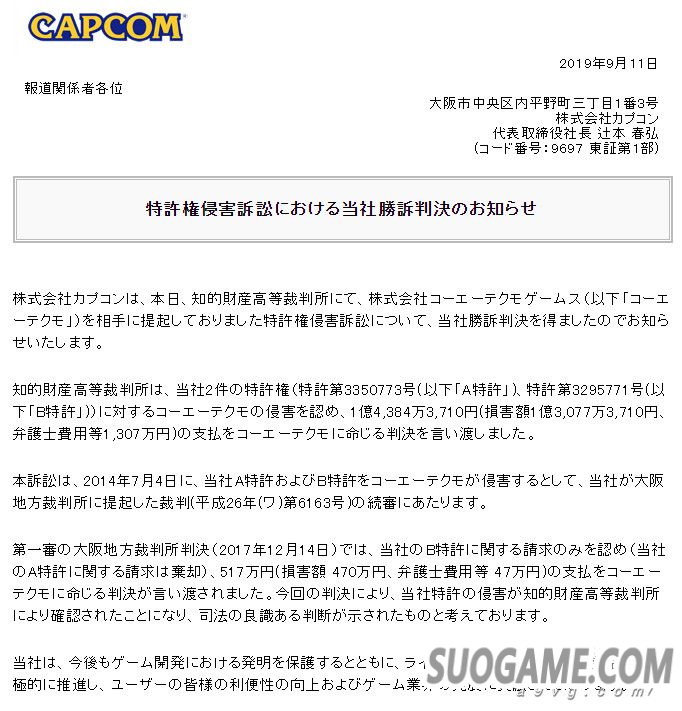 ·2019年9月11日判决KT方面就专利A有一部分侵权,须向CAPCOM赔偿总计约1.4亿日元。