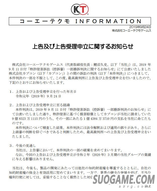 围绕2014年就《战国无双》《真三国无双》《零》系列等游戏侵犯专利的诉讼,在9月11日曾判决KT方面向CAPCOM赔偿约1.4亿日元,对此KT方面表示不服会继续申诉以求撤销部分赔偿。