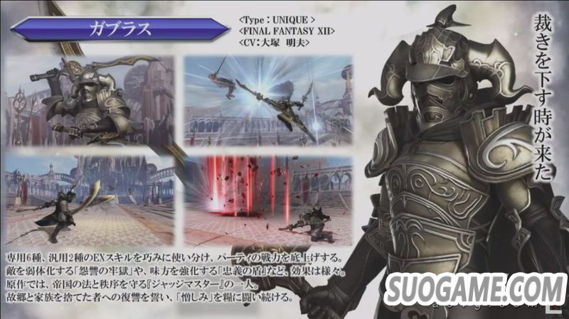 伽布拉斯最初登场于初代《最终幻想纷争》中,在本作中的定位是特殊型角色,可使用各种专用EX技能来限制敌人的行动或加强我方小队成员。