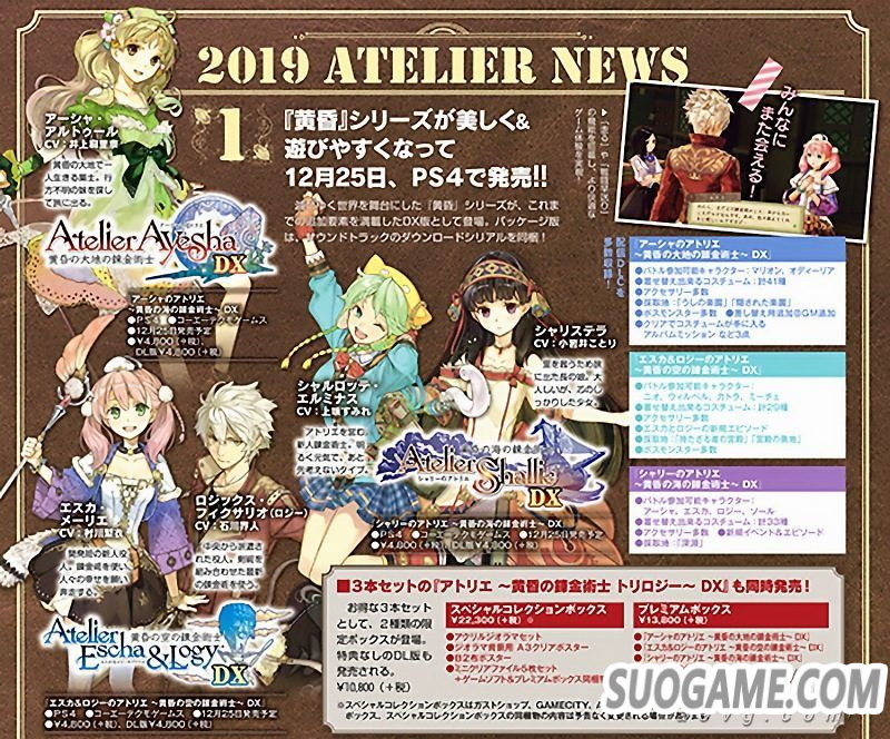 光荣特库摩在TGS期间发表的《工作室》黄昏系列三部曲DX版本:《亚莎的工作室DX》、《艾斯卡与罗吉的工作室DX》、《夏莉的工作室DX》确定将于北京时间12月25日发售,价格各4800日元+税,对应PS4、Switch和PC平台。