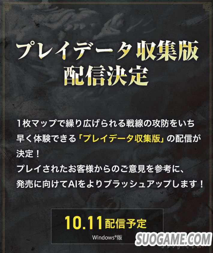 另外KT还宣布将于北京时间10月11日在PC平台推出一个用户数据收集版。该版本可以抢先体验游戏内容(TGS体验版的加强版),并会收集用户数据用以改进游戏AI。