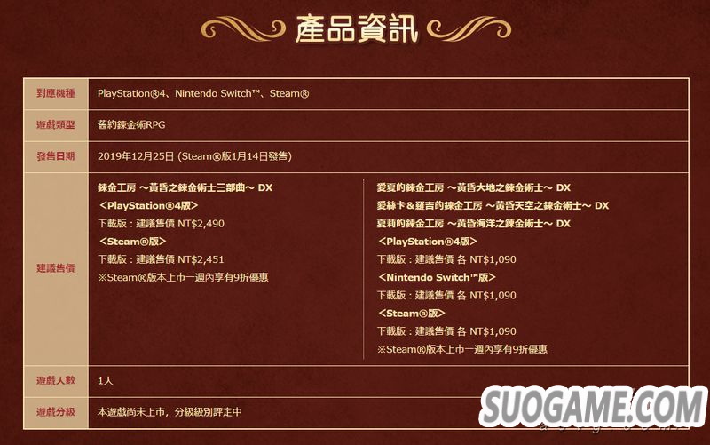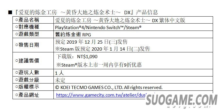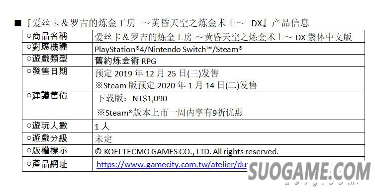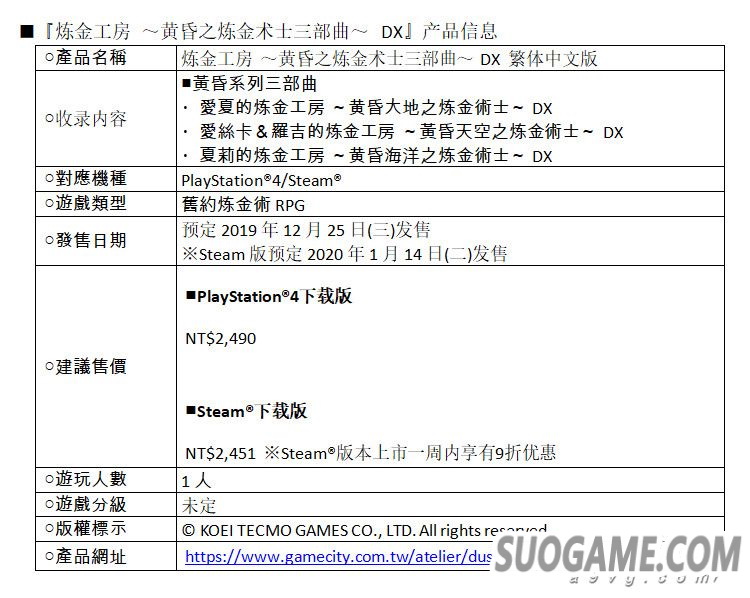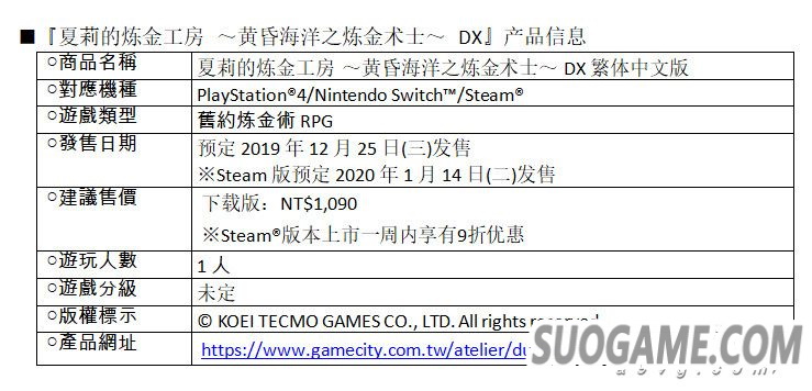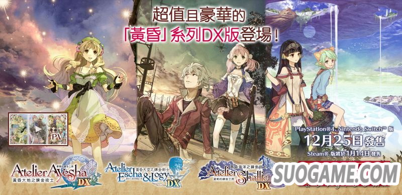 光荣特库摩宣布《工作室》系列黄昏三部曲《爱夏的工作室DX》、《爱丝卡与罗吉的工作室DX》、《夏莉的工作室DX》将于北京时间12月25日同步推出PS4、Switch中文版,而PC(Steam)版预定于2020年1月14日发售。不过根据产品信息显示看上去中文版仅会推出下载版。