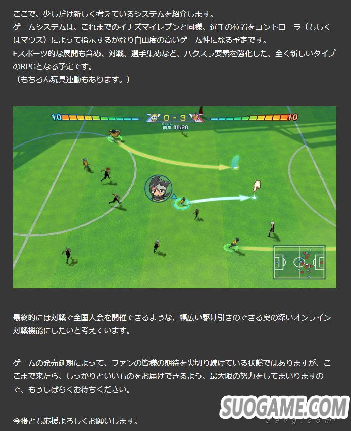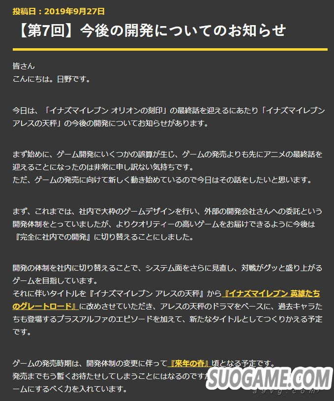 Level-5宣布原定于2019年内发售的PS4/Switch/手机平台新作《闪电十一人 阿瑞斯的天枰》因为动画完结游戏还未能推出,将改变开发体制并改名为《闪电十一人 英雄们的伟大之路》。延期主要是因为此前游戏交给外部的开发公司制作,但品质无法达到要求而转为完全社内开发。