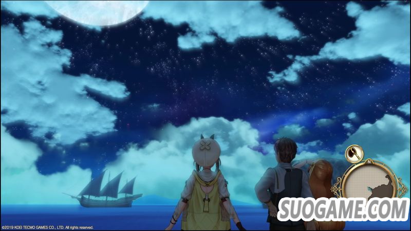 莱莎特别幸运地生在了这个有星空、草原和大海的世界,这里比之前任何工作室的世界都漂亮得多。我在游戏中会时不时地主动拉高镜头来观赏远景,在凌晨和傍晚来观看风景的区别。设计师们也不再羞于展示美景,在特别多地方你会发现一个系列之前特别少见的设定,一些场景中会设置眺望点,当你靠近后,镜头会拉高拉远,让你可以一览远方的风光。