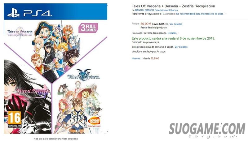 根据西班牙亚马逊的商品页面显示,万代南梦宫或将推出一个包含了《宵星传说 决定版》《绯夜传说》《热情传说》的三合一合集版PS4游戏,将于北京时间11月8日发售,售价50.99欧元。