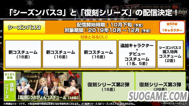 光荣特库摩公开了《死或生6》季票3的信息。季票3包含55种服装以及1名新角色,预定10-12月陆续推出。另外在《DOA5LR》中的人气服装也会复刻推出,第一弹为兔女郎装,包含新角色NiCO在内共16件预定10月15日推出。