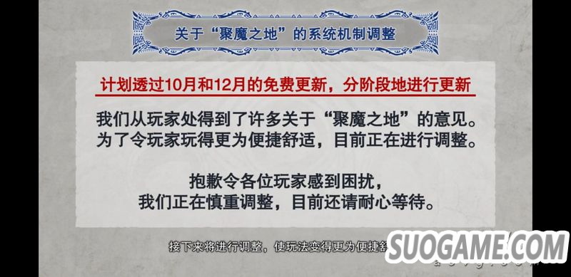 将通过10月和12月的免费更新对聚魔之地进行调整