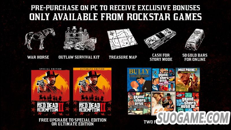通过 Rockstar Games Launcher 预购还能免费升级到 Red Dead Redemption 2 豪华版,特别版和终极版各减 $20。通过 Rockstar Games Launcher 获得的其他预购奖励还包括: