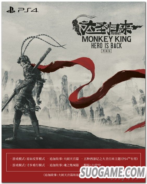 PlayStation?4《西游记之大圣归来》限量珍藏套装包含500GB PS4?主机(黑色/冰河白)一台、配套DUALSHOCK?4无线控制器(黑色/冰河白)一只、《西游记之大圣归来》“标准版” 软件一张,《西游记之大圣归来》定制版PS4?上盖(黑色/冰河白)一个,并且可获得《西游记之大圣归来》标准版兑换卡(包含游戏模式“易如反掌模式”和“寸步难行模式”)一张,建议零售价为2,199元人民币。