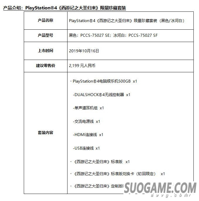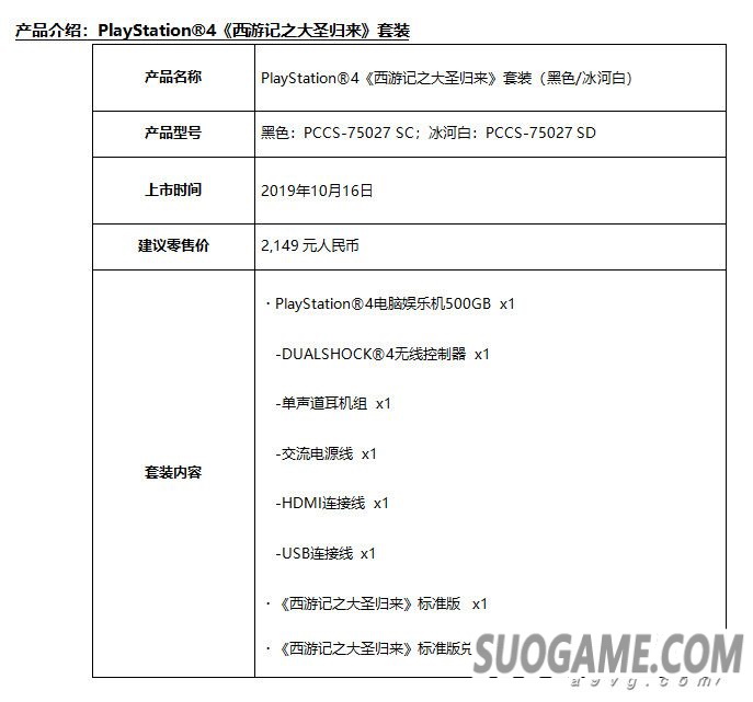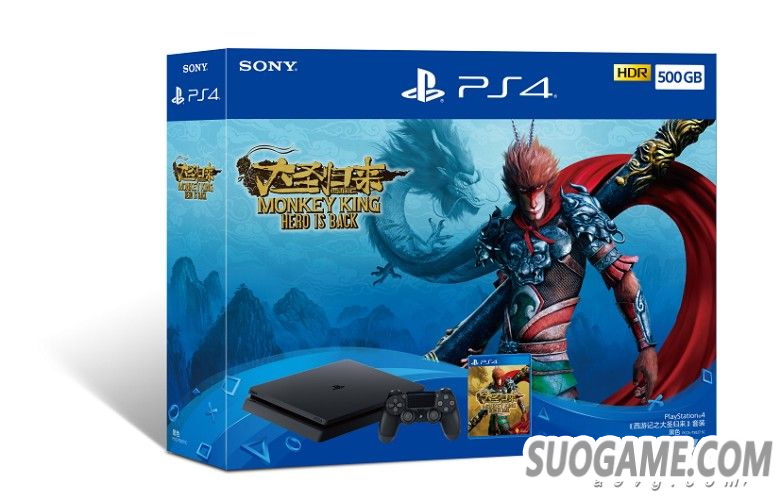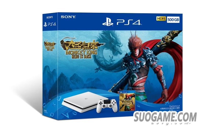 PlayStation?4《西游记之大圣归来》套装包含500GB PS4?主机(黑色/冰河白)一台、配套DUALSHOCK?4无线控制器(黑色/冰河白)一只、《西游记之大圣归来》“标准版”软件一张,并且可获得《西游记之大圣归来》标准版兑换卡(包含游戏模式“易如反掌模式”和“寸步难行模式”)一张,建议零售价为2,149元人民币。