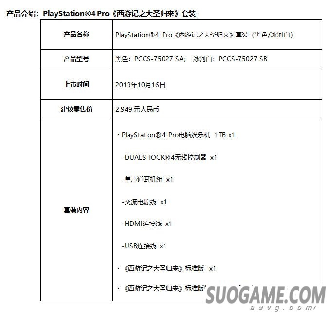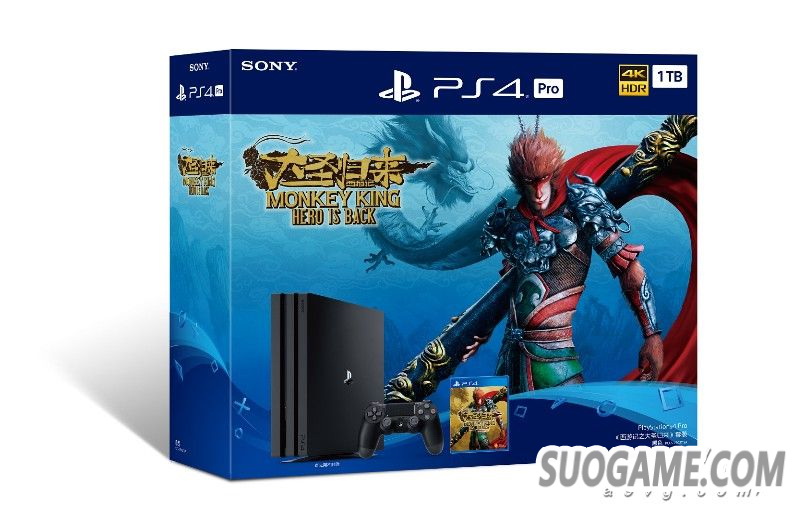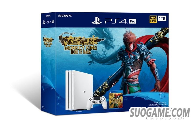 PlayStation?4 Pro《西游记之大圣归来》套装包含1TB PS4?Pro主机(黑色/冰河白)一台、配套DUALSHOCK?4无线控制器(黑色/冰河白)一只、《西游记之大圣归来》“标准版”软件一张,并且可获得《西游记之大圣归来》标准版兑换卡(包含游戏模式“易如反掌模式”和“寸步难行模式”)一张,建议零售价为2,949元人民币。