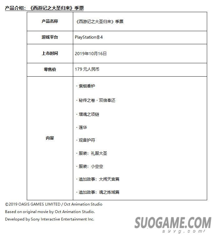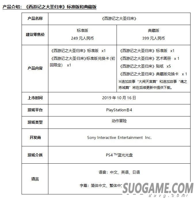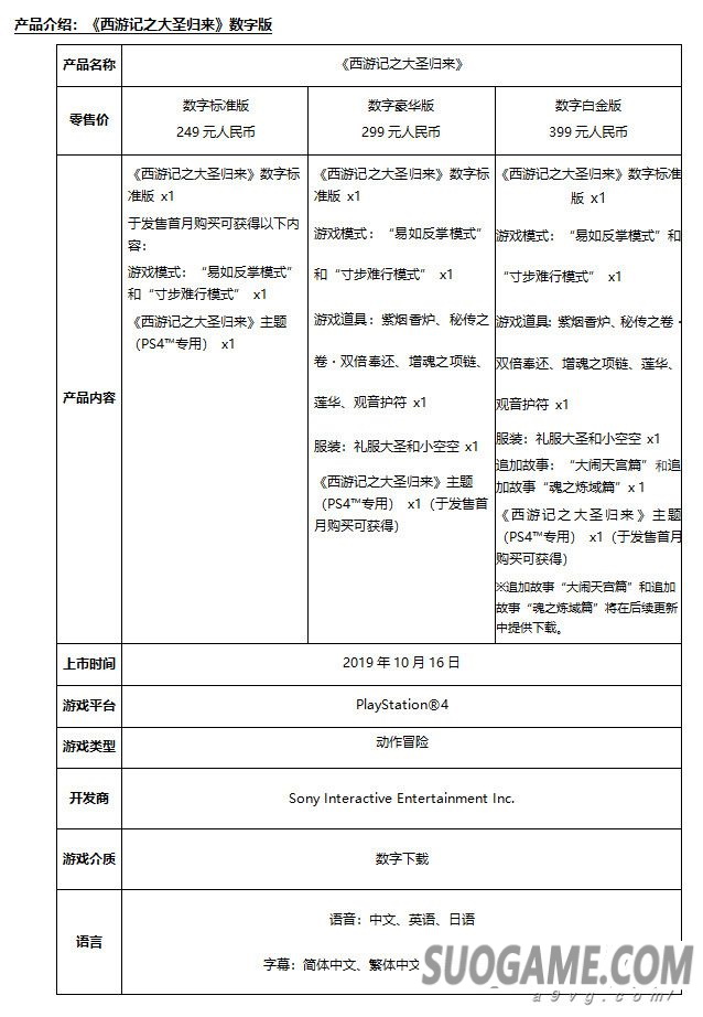 索尼互动娱乐公司(上海)有限公司和上海东方明珠索乐文化发展有限公司今日宣布,将于北京时间2019年10月16日在中国大陆市场全球首发PlayStation?4简体中文游戏《西游记之大圣归来》,“标准版”和“典藏版”建议零售价分别为249元人民币和399元人民币。PlayStation?4《西游记之大圣归来》套装、PlayStation?4《西游记之大圣归来》限量珍藏套装和PlayStation?4 Pro《西游记之大圣归来》套装将同步发售,建议零售价分别为2,149元人民币、2,199元人民币和2,949元人民币。