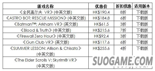 港服PS商店推出PlayStationVR推出三周年优惠活动,截至10月24日79个VR游戏内容低至三折,包含《夏日课程》、《大众高尔夫VR》、《宇宙机器人 搜救行动》等。另外SIEH也推出了实体VR游戏及PS VR硬件套装的优惠活动。